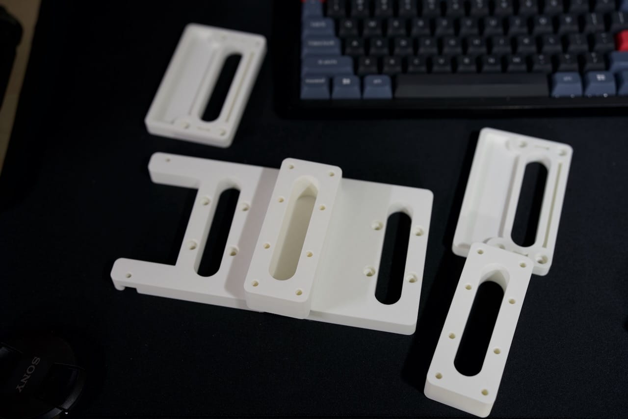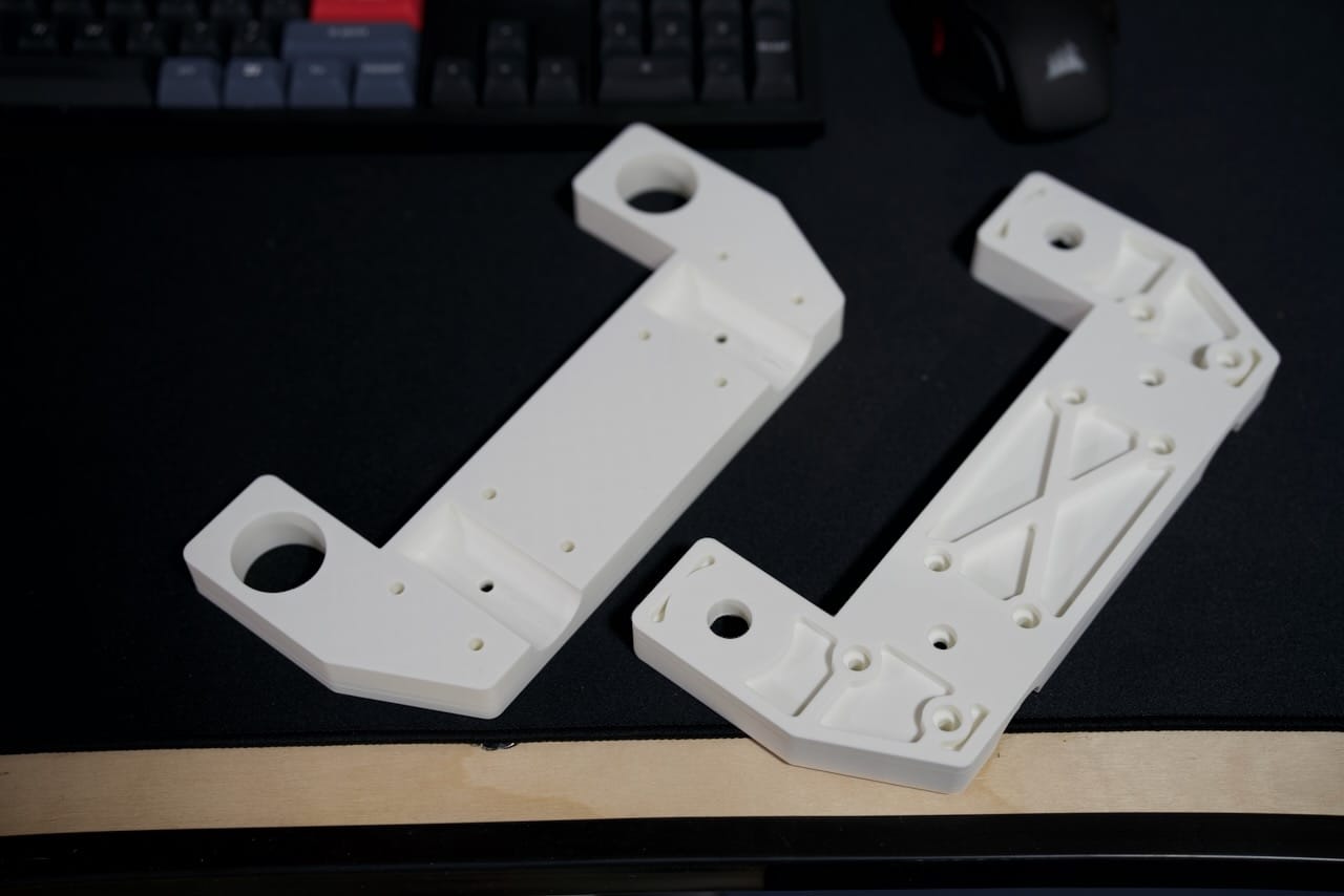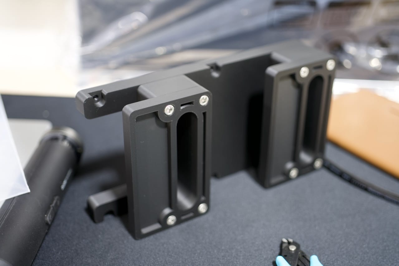 The assembled version makes a little more sense though- you can see the assembled version in black below. This screws onto the back of the monitor with M4 screws, I recommend 15mm but you will want to check for your specific monitor.