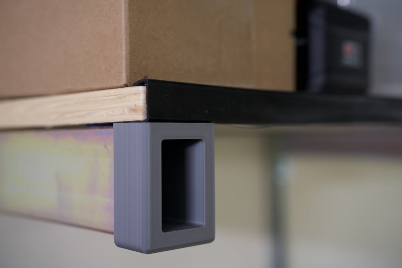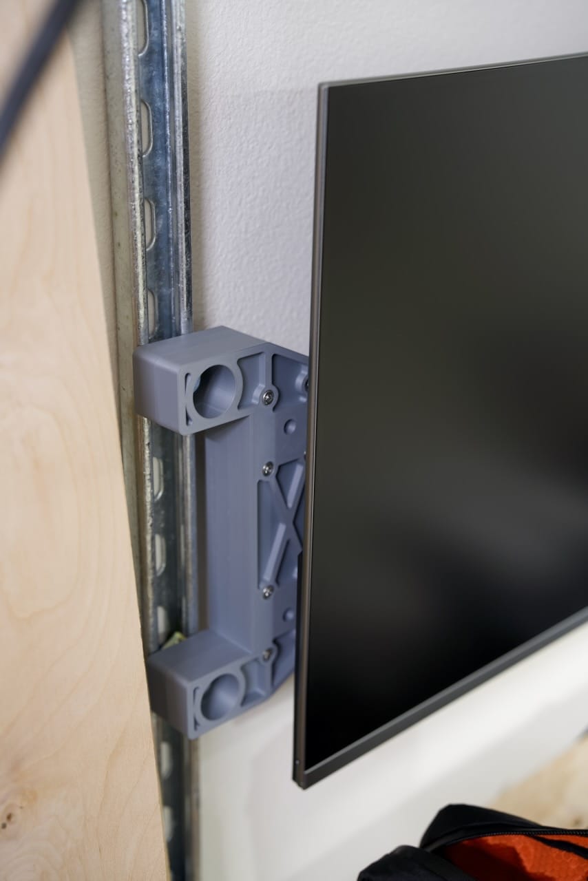 shown below are the parts 3D printed for the VESA hanger- they all fit on the bed of a Bambu X1C in a single print, but take a while given these are structural parts. They don't need to hold too much, since the Viewsonic monitors are pretty light. This also means the monitors are hanging on the EMT conduit, so they can be easily lifted off when needed.