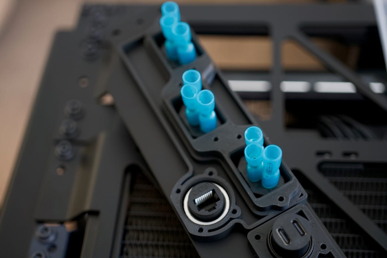 If you look closely you can see the rear of the RJ45 connector for the 2.5Gbe Ethernet. This may seem unnecessary but it's far easier to plug into the front panel of the Recovery Kit Ultra than it is to get into the rear of the motherboard each time you want to connect something. You can also see the USB-C connectors, which end up getting connected back to a mix of the motherboard's USB 3.x connectors on its IO panel. Those cables are extremely expensive to make custom, and I don't roll natural 20's on dexterity so I'm not making my own USB C cables. Instead, the cables are 3 footers and just run along an outside edge to make them fit just right in the build.
