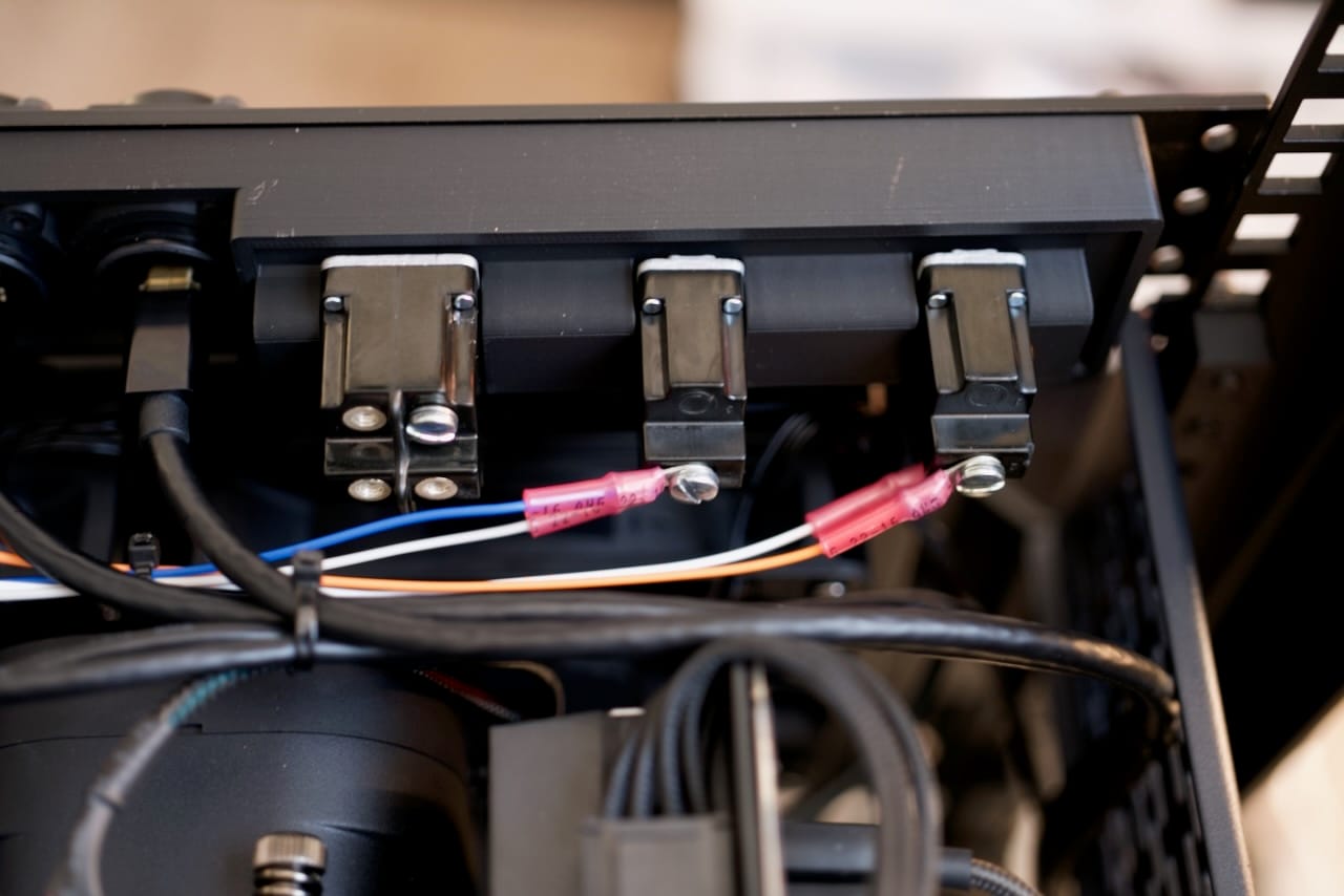 The panel inherits many of the same ideas from the original Recovery Kit, keeping that retro-futuristic and highly practical approach, just so long as you don't notice the price tag on sealed mil-spec toggle switches. In my defense, their CLACK is worth every penny. To keep wiring clutter to a minimum, I ran custom-length power cords for the internal power between the panel and the networking and PC power supplies. Each panel mount had a simple set on the back for connecting, including the 3x C14 power connectors on the panel, which are just connected via spade connectors to the power cords internally. You can see me doing fit/clearance tests with the spade connectors below.