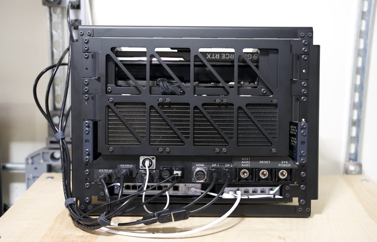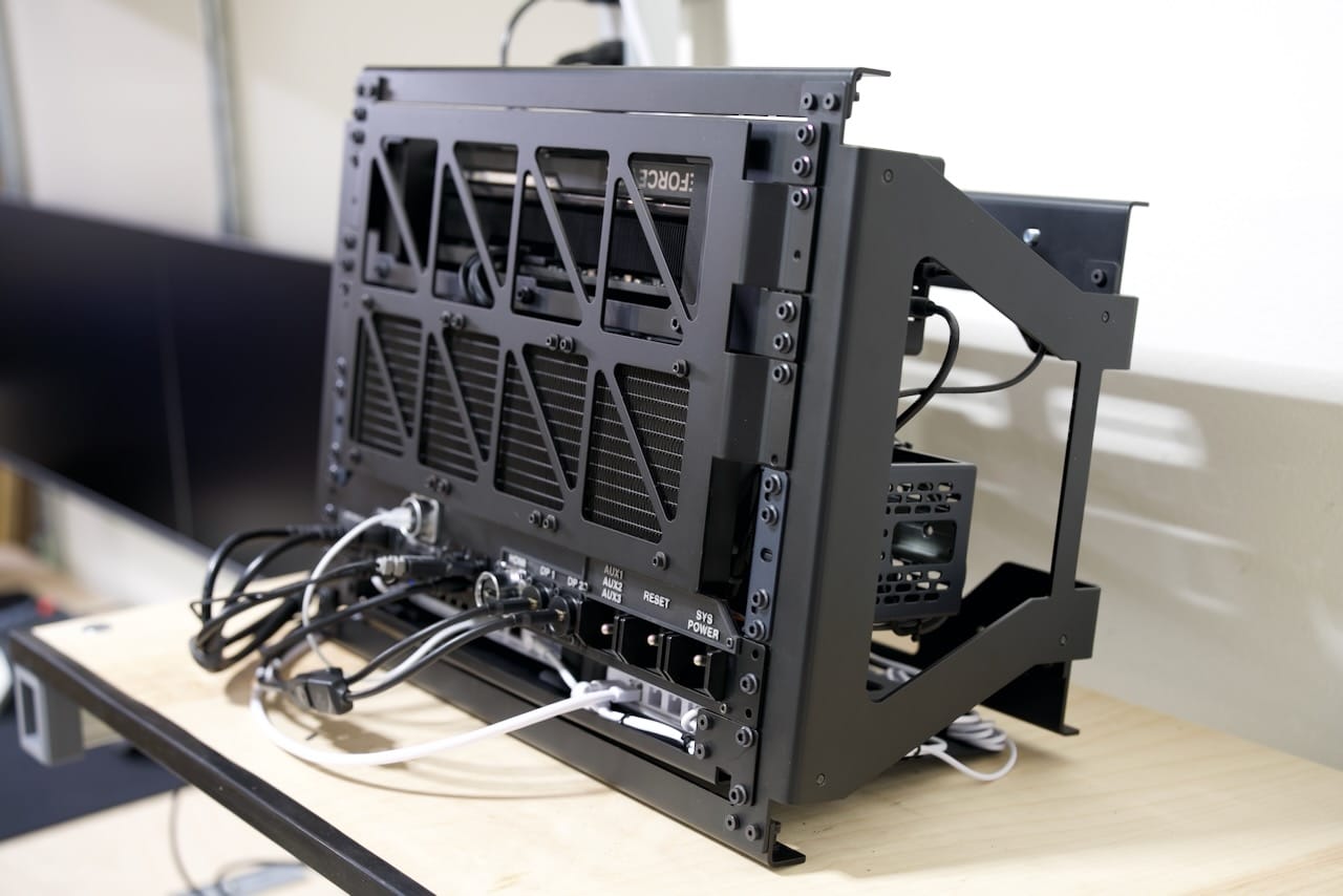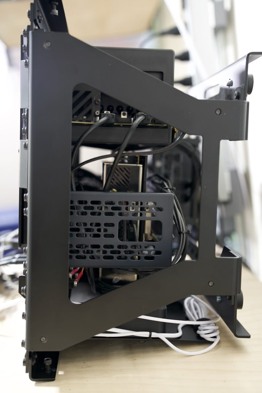First, the sheer weight creates a risk for the motherboard PCI-E connector, so I needed to either make sure the GPU and motherboard always moved in unison or the connection between the two needed to be flexible. If I designed the CPU, motherboard, and GPU as a single unit, it would be less modular, and frankly even more complicated. Instead, I used a simple GPU riser cable to connect the GPU to the motherboard. This solved the issue by allowing me to build a frame around the GPU and connect with the riser cable. This lets me install the motherboard, then install the GPU, then connect them once they are both secure.