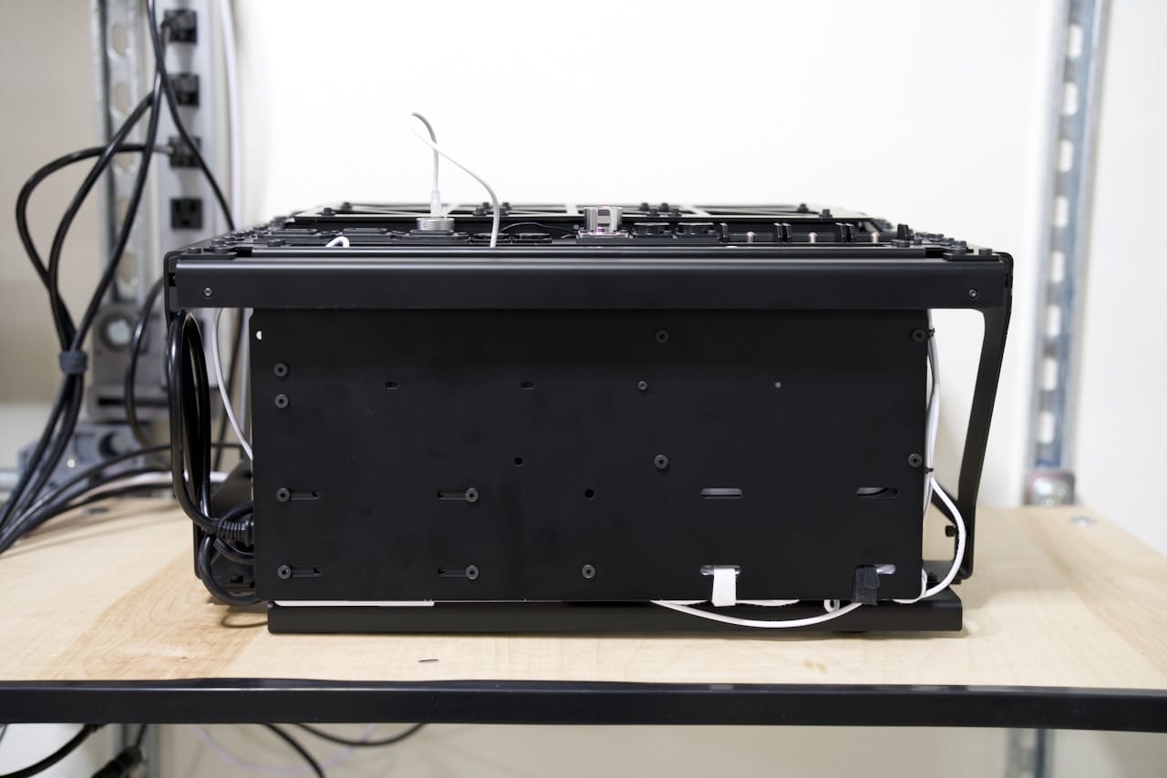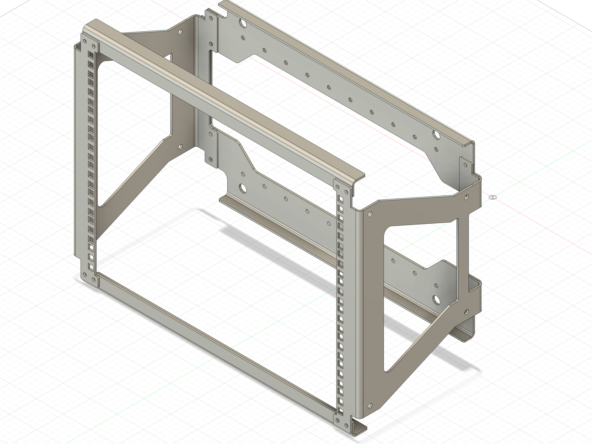 The core frame of the Recovery Kit Ultra is made from powder coated 5052 H32 Aluminum (0.125"). The bends give it strength from flexing, giving us a quite reasonable frame to work with. There are threaded mount points throughout, including the sides and bottom of the unit- which is where the SFX power supply for the build is located. The bottom screws are spaced along two lines, as well as the corners. The corner holes are where I've had threaded holes for rubber feet installed. Everything besides the power supply mounts to the standard 19" rack. Due to the design decision to go with aluminum, the 0.125" thickness plus the powder coating makes the rack squares a bit too thick for traditional rack nuts. You can use slide-on nuts just fine, but instead I opted for my own custom 3D printed nuts for now, which may get CNC'd in the near future. For now, the system has worked quite well with 8U of shallow depth rack storage usually geared more towards shallow depth audio or networking gear. This outside frame has identical top and bottom front bars, with a 90 degree bend for rigidity. The bottom is a single part, plus the two sides. The two sides are not identical to work around the spot in the case where Pelican put the integrated case handle. Each part has several threaded nuts inserted by Send Cut Send as part of their parts fabrication. (Send Cut Send has not sponsored this build)