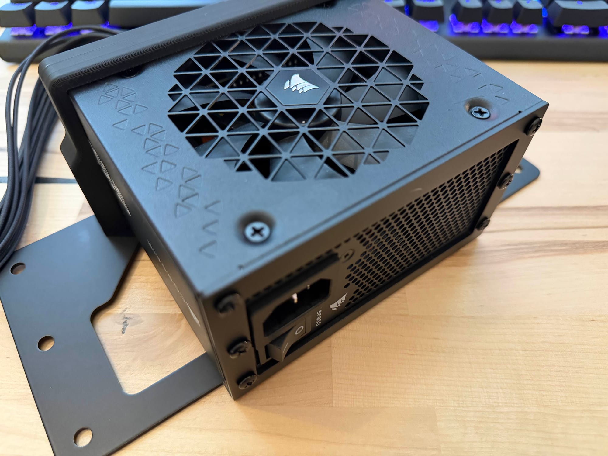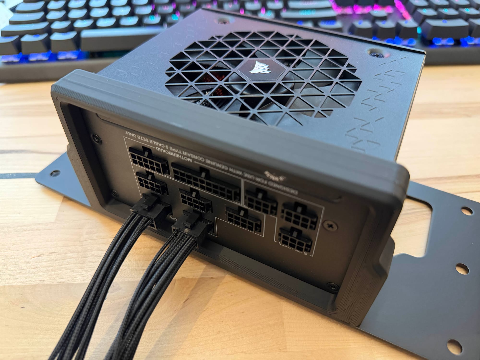 The opposite side shows the 3D printed bracket holding the PSU snugly in place.
