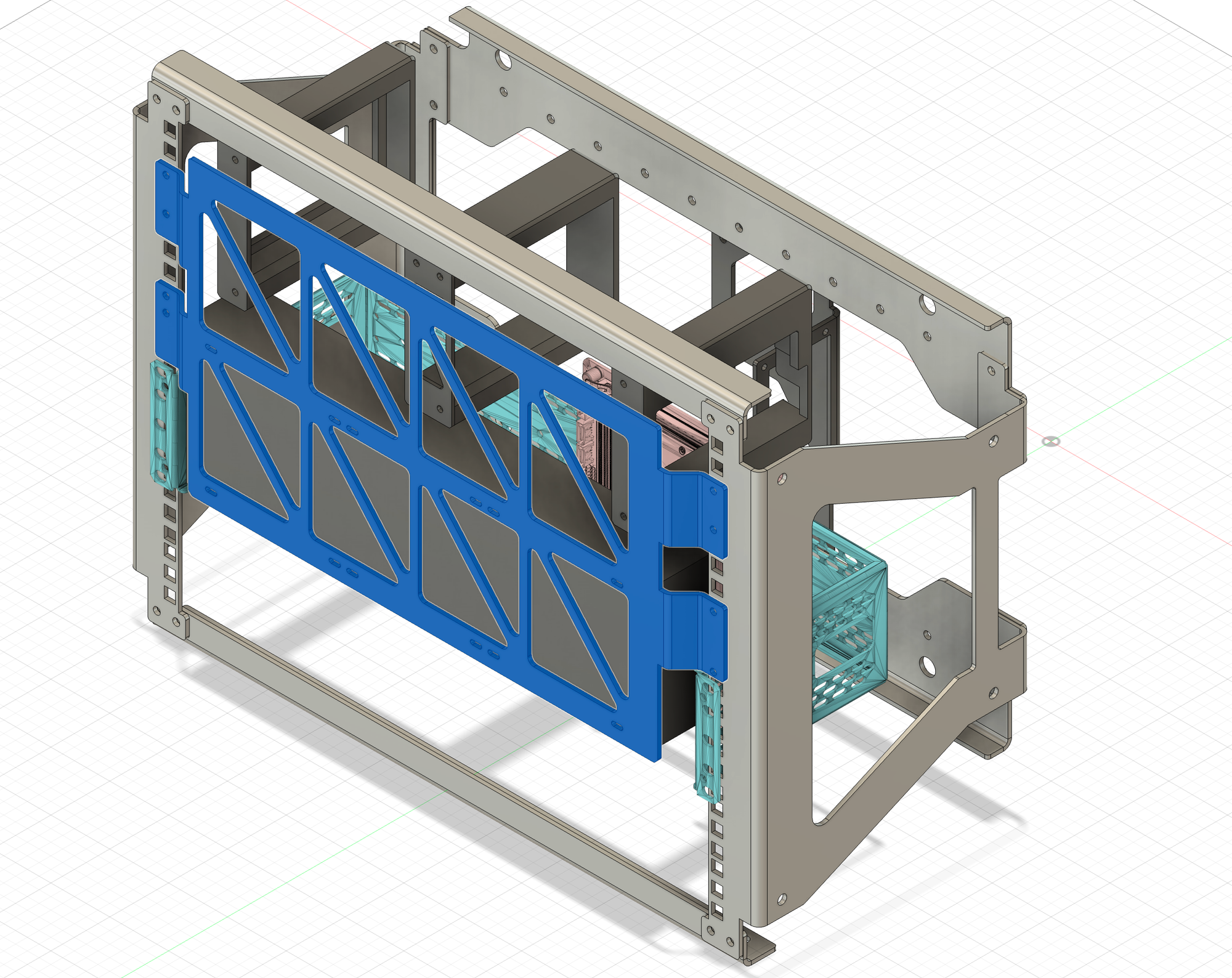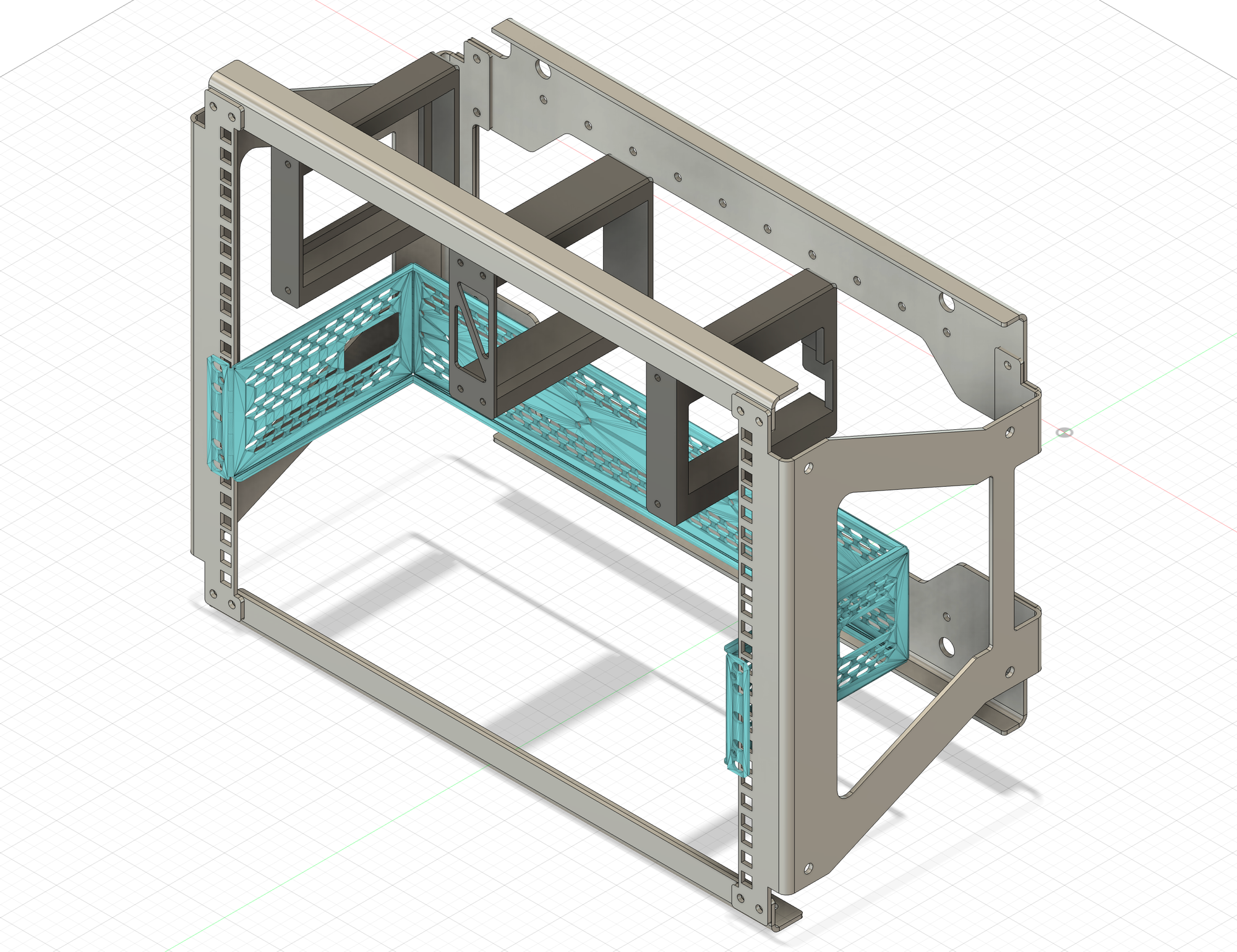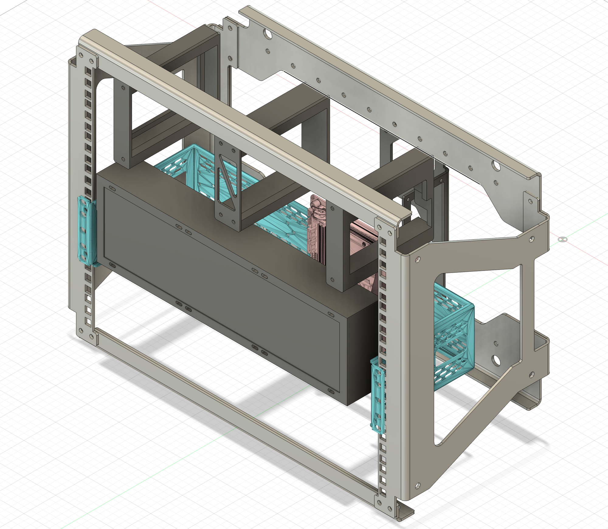 Shown below you can see an early prototype of the grey plastic adapter and grey powder coated shelf for the network. I'd normally rely on traditional mounts but these smaller consumer network items are meant for static mounting, and moving them around could cause the network components to disconnect if I relied on their factory mounts. The cage is meant to be minimal to allow as much clearance and airflow as possible- even with the optimizations the network shelf is a little more than 1U tall, something I plan to address in the future.