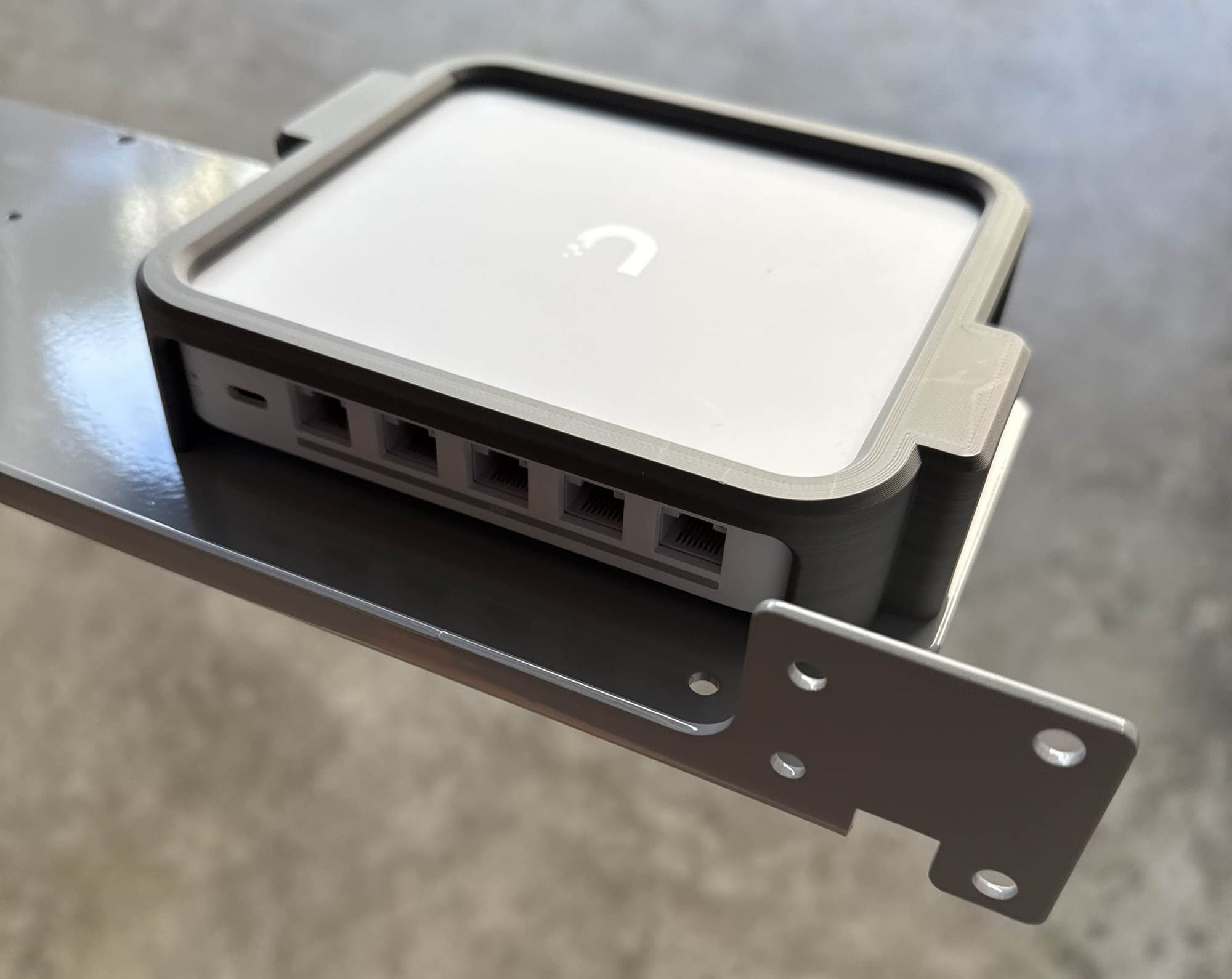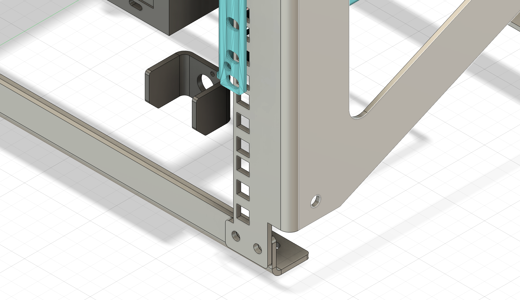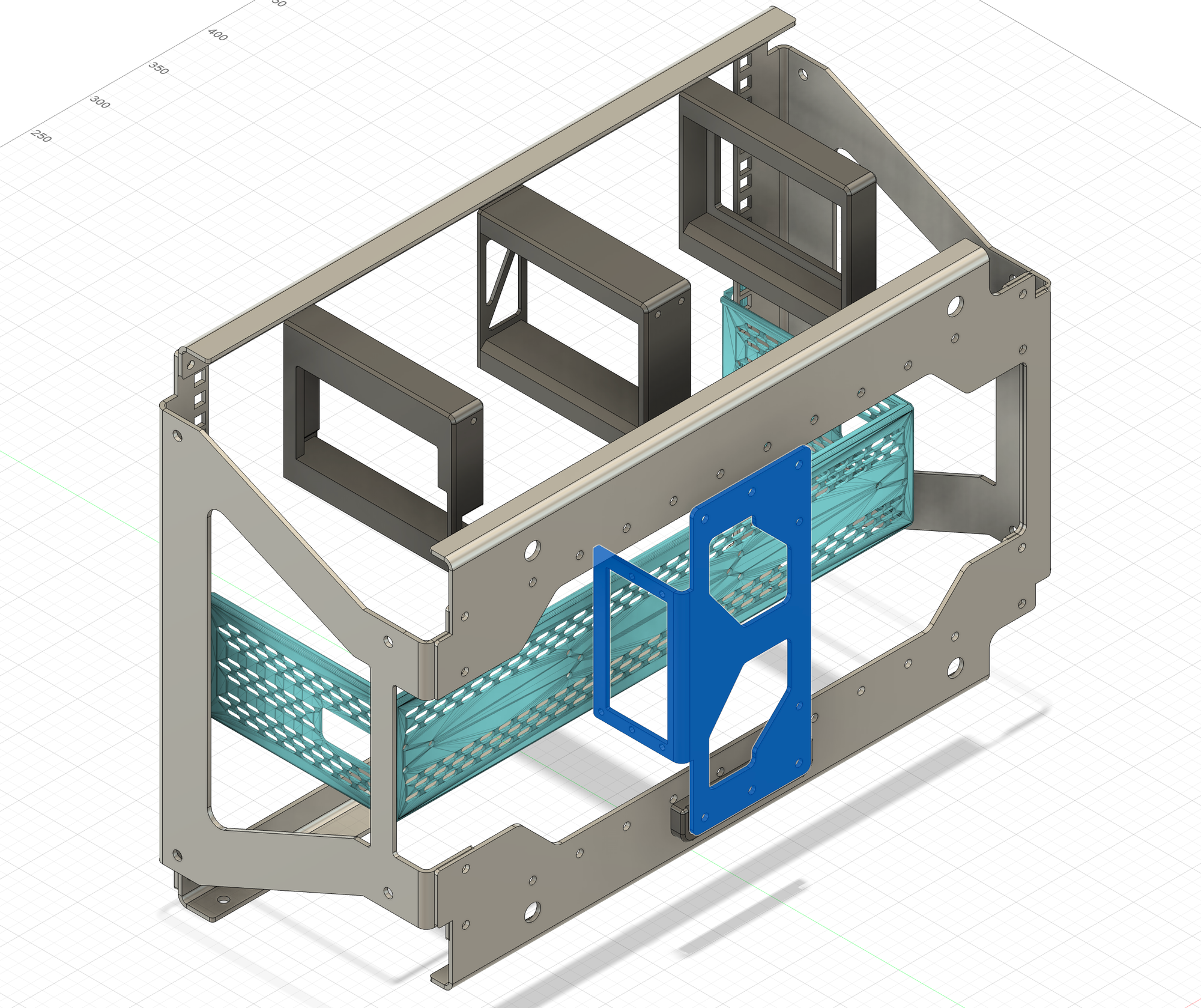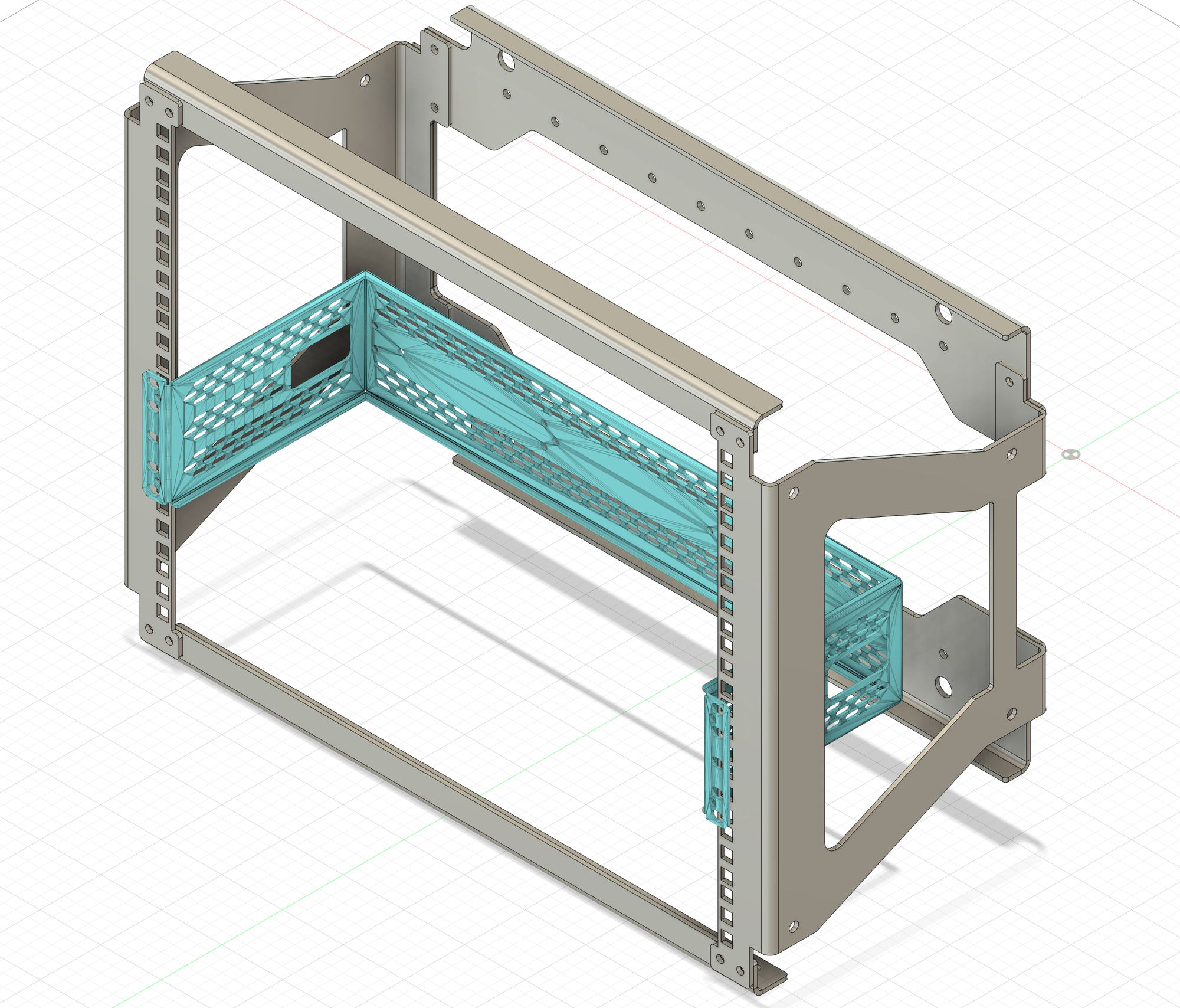 Shown below you can see an early prototype of the grey plastic adapter and grey powder coated shelf for the network. I'd normally rely on traditional mounts but these smaller consumer network items are meant for static mounting, and moving them around could cause the network components to disconnect if I relied on their factory mounts. The cage is meant to be minimal to allow as much clearance and airflow as possible- even with the optimizations the network shelf is a little more than 1U tall, something I plan to address in the future.